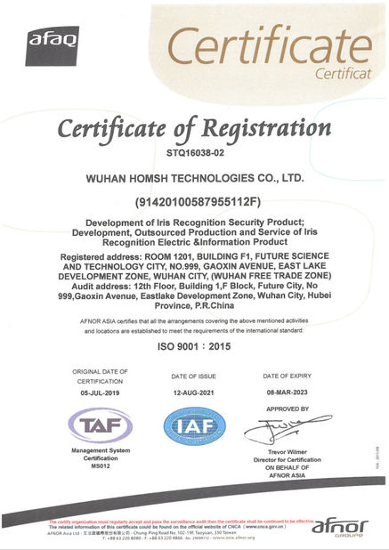 شرکت Homsh Technologies گواهینامه سیستم مدیریت کیفیت، استانداردهای سیستم مدیریت ایمنی بهداشت شغلی،استانداردهای سیستم مدیریت محیط زیست و استانداردهای سیستم ملی مدیریت مالکیت معنویاز آزمون کیفیت محصول توسط ادارات مانند مرکز آزمون ملی کیفیت محصولات سیستم هشدار امنیتی و ایمنی (پکن) ،مرکز ملی آزمایش کیفیت محصولات سیستم های هشدار امنیتی و ایمنی (شانگهای)، Guangzhou GRG Metrology & Test co., Ltd و آزمایشگاه های بل در فرانسه.